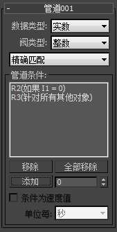 “管道条件”组中的列表框将显示用于确定哪些数据输入通过管道进行输送的条件。对于所有阀类型(布尔类型除外),这些是基于指定值的范围。默认情况下,如果阀类型不是布尔,则单个条件(输入)存在并设置为“全部”,这表示仅通过管道输送输入数据。通过使用“添加”按钮添加条件,以下为更多选项的说明