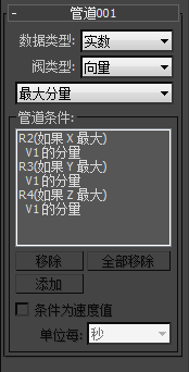 在使用阀的情况下,传入的值 V1.x、V1.y、V1.z(向量的分量)将成为阀控制器。使用下拉列表,可以选择向量分量用于管道输送的方式:最大分量、最大绝对分量、最小分量或最小绝对分量。使用向量阀类型,“添加”和“删除”按钮将不可用,原因为输入数据通道的数量固定为 3 个,类似于布尔阀类型,其中的输入数据通道数量固定为 2 个。