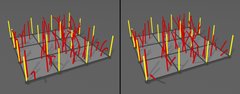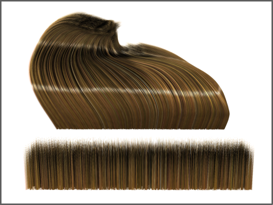 卷发实际上计算两个噪点域,两者都使用相同的频率设置和相同的梢/根振幅。一个噪点域相对于毛发是静态的。“动画”参数可用于通过毛发随时模拟第二个噪点域的动画。这对于类似草地之类的对象非常实用,否则计算真实的动画将会消耗过多的资源。这些参数提供了类似的结果,其消耗的资源只是计算消耗资源很小的一部分。