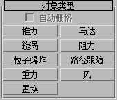 这些空间扭曲用于影响粒子系统。“支持对象类型”卷展栏中指明了各个空间扭曲所支持的系统。