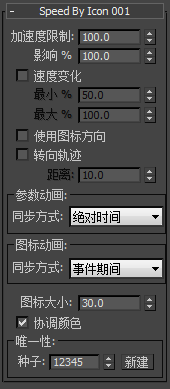 默认情况下,“速度按图标”只按图标位置的动画来控制粒子运动。如果启用“使用图标方向”,那么“粒子流”还会将图标旋转应用于粒子运动。其实,此运动为环绕运动,其范围取决于每个粒子和图标之间的距离。默认设置为禁用。
