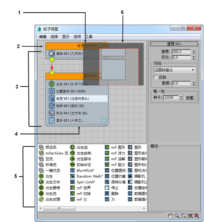 全局事件还用作粒子系统的“粒子视图”表示。可以通过重复此事件或通过添加“Empty Flow”和“标准流”来新建系统。相反,如果在视口中克隆“粒子流”图标,或添加新的“粒子流源”,那么此新系统也会在“粒子视图”中显示。