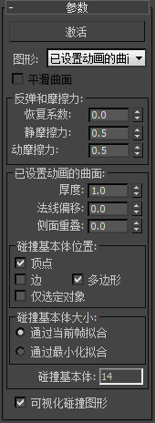 注: 将“图形”(请参见下文)设置为“已设置动画的曲面”选项后,只有当启用三个主要“碰撞基本体位置”选项(“顶点”、“边”和“面”)中的一个或多个时,“激活”选项才可用。有关详细信息,请参见下文中的“碰撞基本体位置”组。