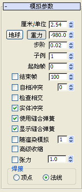 “模拟参数”卷展栏设置用于指定重力、起始帧和缝合弹簧选项等常规模拟属性。这些设置在全局范围内应用于模拟,即应用于模拟中的所有对象。
