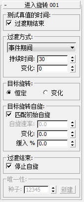 设置为 0.0 时,测试在初始旋转速率和最终旋转速率之间生成一个线性插值,设置为 100.0 时,最终旋转速率会更早达到。为了最平滑地到达目标方向,应将“自旋速率”和“变化”设置为 0.0,将“缓入”设置为 100.0。