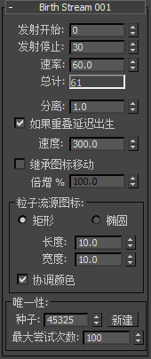 启用时,生成的粒子总数将与“总计”字段中显示的数值相同,但是一些粒子可能会在“发射停止”参数指示的帧后生成。禁用时,将在“发射停止”帧之前生成所有粒子,但是生成的粒子总数可能会与“总计”字段中的值有所不同。