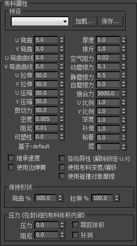 压缩阻力。尽管这些值默认为 50.0,但是却与它们相对的拉神值很相似,指定比拉神值低的值可获得很好的效果,因为沿着布料纤维的长度对其进行压缩,它将弯曲而不是收缩。