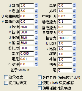 弯曲阻力。此值设置的越高,织物能弯曲的程序就越小。棉织物可能比皮革易于弯曲,因此采用 15.0 的 U 和 V 弯曲值可能适合于棉,50.0 比较适合于皮革。