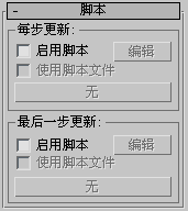 该卷展栏使您可以将脚本应用于每个积分步长以及查看的每帧的最后一个积分步长处的粒子系统。使用“每步更新”脚本可设置依赖于历史记录的属性,而使用“最后一步更新”脚本可设置独立于历史记录的属性。