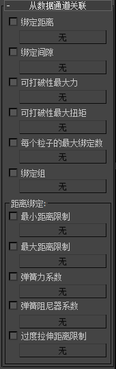 使用脚本关联时,可以通过以下两个附加卷展栏将“mParticles 粘合”绑定参数连接到数据通道:“从数据通道关联”和“关联到数据通道”卷展栏。