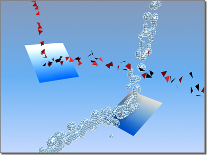 “导向器”空间扭曲起着平面防护板的作用,它能排斥由粒子系统生成的粒子。例如,使用导向器可以模拟被雨水敲击的公路。将“导向器”空间扭曲和“重力”空间扭曲结合在一起可以产生瀑布和喷泉效果。