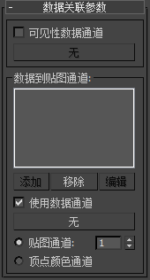 若要将数据通道添加为贴图通道,请首先单击“使用数据通道”复选框下的“无”按钮来拾取“实数”或“向量”类型的数据通道。然后,选择此数据通道要转为的贴图通道:“贴图通道”(还会设置通道数)或“顶点颜色通道”。最后,单击“添加”按钮。