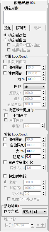 - 将粒子锁定到变化的曲面上。当对象的曲面随时间更改形状或详细信息(如已设置动画的子对象或参数、变形或蒙皮修改器)时使用此选项。如果只通过变换(位置/旋转/缩放)设置对象动画,则可以通过使该选项处于禁用状态节省处理时间。