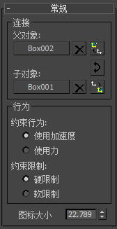 使用这些控件可以将刚体指定给约束。可以将父对象和子对象都指定给约束,也可仅指定子对象。父对象可以是任何刚体类型;子对象必须为动力学类型。