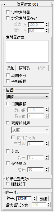 使用“位置对象”设置来控制发射器上粒子的初始置换。可以设置发射器从其曲面、体积、边、顶点、轴或子对象选择发射粒子。还可以使用应用于对象的材质来控制粒子发射。