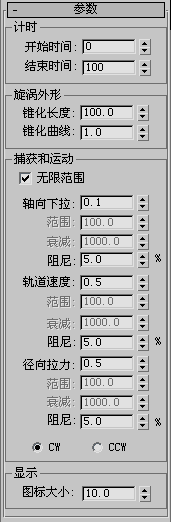 使用空间扭曲设置可以控制漩涡外形、井的特性以及粒子捕获的比率和范围。粒子系统设置(如速度)也会对漩涡的外形产生影响。