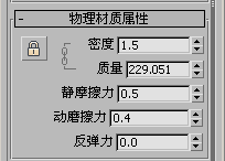 第一次为对象指定 MassFX 刚体修改器时,MassFX 会指定物理材质属性的默认集(包括密度 = 0.5 等),但不会指定物理材质。因此活动“预设”为“(无)”,且可以立即编辑材质属性。如果从列表中指定预设,其设置会显示在“物理材质属性”卷展栏上,但被锁定,无法使用。要编辑设置,请单击“锁定”按钮以解除锁定。