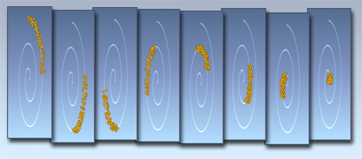 - 使粒子随时间以路径为中心全部会聚或发散,或者部分会聚部分发散。通过选择“收缩”、“扩散”或“二者”可以指定效果(请参见下列内容)。这会在路径长度上产生一种锥化效果。