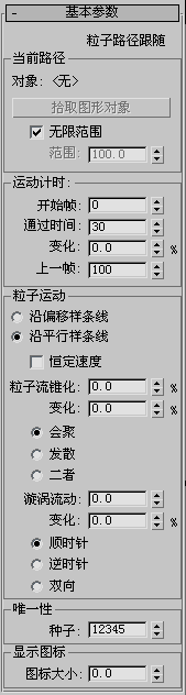 如果粒子移动后没有沿发射器运动,则应更改任一“路径跟随”参数,对其运动进行纠正。