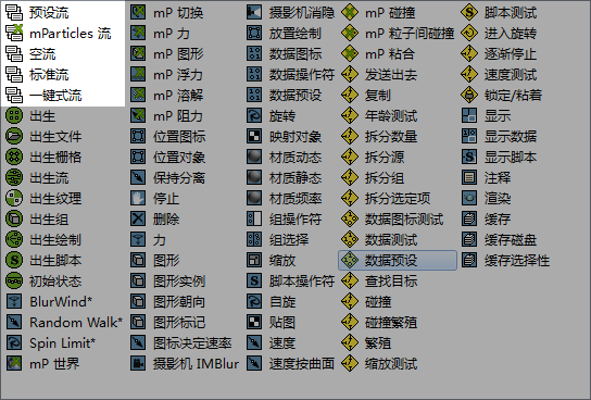 “预设流”会将以前保存的“粒子流”设置合并到当前场景中。这可允许将流用作当前流内的事件,或用作新粒子系统的起始点。