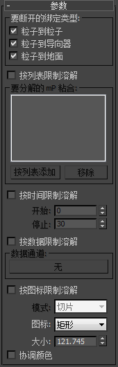 - 选择要移除的绑定的类型。“mParticles 粘合”可以生成不同类型的绑定,如“绑定对象”组中所定义。您可以切换移除粒子之间(粒子到粒子)、粒子和导向器之间(粒子到导向器)以及粒子和地面之间(粒子到地面)的绑定。