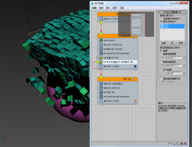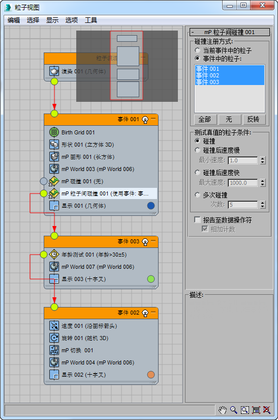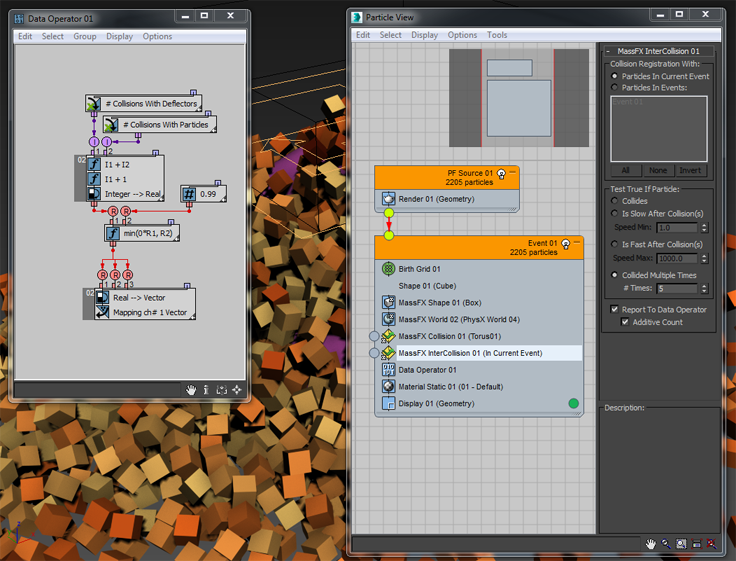 为说明“测试真值的粒子条件”组中“碰撞”和“多次碰撞”选项之间的差异,请参见另一个示例: MassFXInterCollision02.max。 此示例包含两个事件,如果根据“次数”选项粒子彼此碰撞 15 次,则粒子将重定向到第二个事件。在下一个事件中,粒子将设置为静态:“速度”和“自旋”都等于 0。“速度”和“自旋”值由常规的“粒子流”操作符(“速度 01”和“自旋 01”)来设置,但为使粒子处于静态,需要使用“mParticles 切换”操作符。