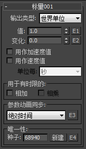 - 如果“输出类型”为“世界单位”,则可以选择其中任意一项,以使粒子流将标量数据用作加速度或速率(以每帧的单位数、每秒的单位数或每滴答的单位数表示)。您可以只激活“加速度值”或“速度值”,但不能同时将其激活;再次单击可禁用此选项。