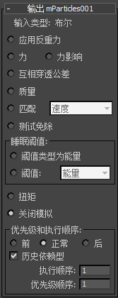 在“输出 mParticles”卷展栏末尾的“历史依赖型”和“执行顺序/优先级顺序”设置与任何常规“输出”子操作符相同。详细信息请参见优先级和执行顺序。