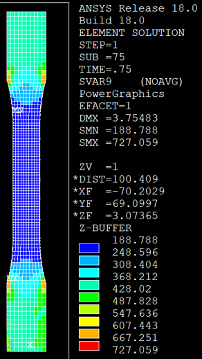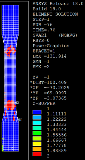 - 逐步完成分析(),然后在拉伸位移载荷应用到样本时监视 SVAR9。请注意切口计量区域中的 SVAR9 值比剩余样本低了多少。这表示大量可塑性或材料软化。