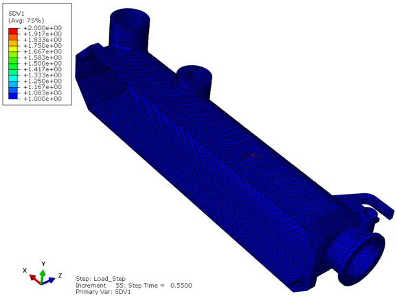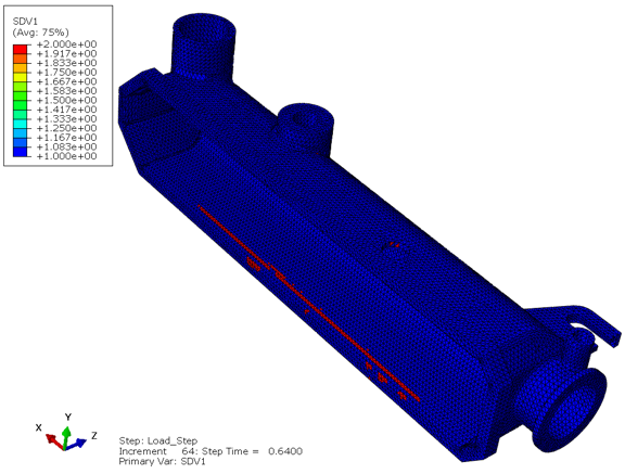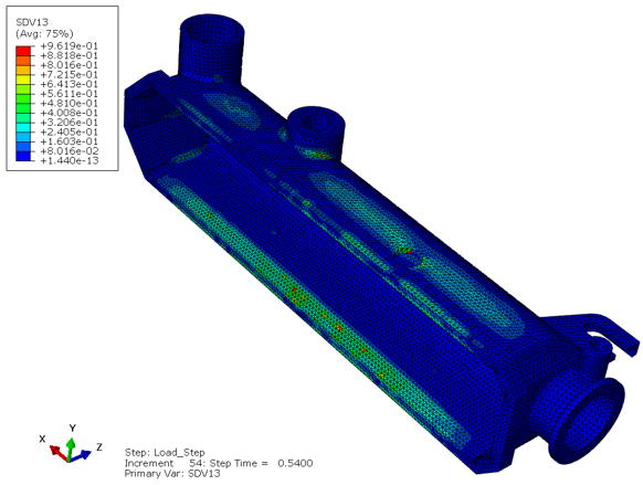 查看特定状态变量的等值线图是计算散热器水箱结构性能的最佳方法。特别是,我们将检查 SDV13(基体失效指数)和 SDV1(断裂状态)。