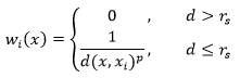 其中 p 是距离权重系数,rs 是搜索半径。距离权重系数的默认值为一,但可以使用 HIN 文件(熔接面映射)进行调整。如果点位于关注区域之外(该点距高斯点的距离非常远时),搜索半径将强制权重 wi(x) 变为零。搜索半径采用以下方程进行确定: