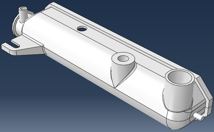 散热器水箱模型已输入到 Moldflow 中,以便可以运行填充 + 保压分析来确定纤维填充零件的取向。该模型现在可以使用 Abaqus/CAE 打开,其中载荷和边界条件可以应用到该模型。