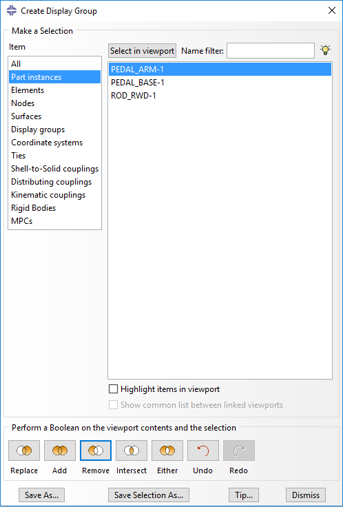 - 创建一个显示组(“Tools”>“Create”>“Display Group”),用于隐藏踏板臂零件实例。