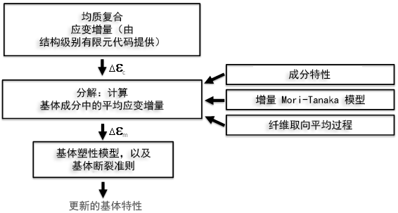 下图描绘如下分解过程的示意图:在塑性基体成分材料中,将均质合成应变增量映射到平均应变增量。分解过程 [11,12] 利用即时(切线)成分特性、增量 Mori-Tanaka 微观力学模型和纤维取向张量。使用基体成分中计算的平均应变增量驱动基体塑性模型,并预测基体切线模量的演变。