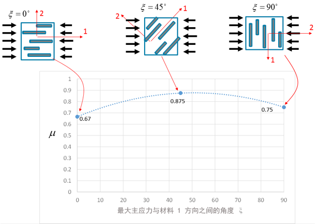 下图显示了相对于主纤维方向,μ 如何依赖于主压缩应力方向的示例。