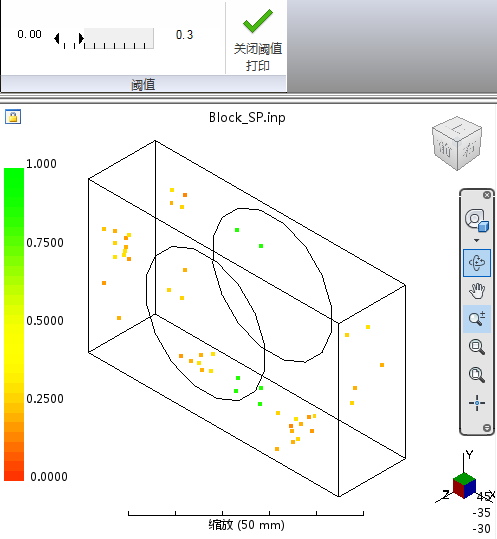 拖动阈值比例尺上的箭头,控制高斯点在图中可见的范围。例如,在比例尺右侧将箭头拖动到 0.3,以便显示模型中可能需要额外细化的高斯点位置。