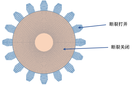 让我们看一下示例用例。在此示例中,我们要为不预期失效的齿轮模型区域关闭断裂。假设实验测试结构向我们显示失效仅发生在齿轮的齿中,而不是底座中。由于我们仅预期失效发生在齿中,因此我们可以为模型其余部分关闭断裂。这有可能降低此分析的运行时。