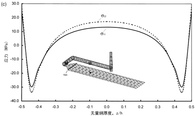 此时,我们可以评估翘曲后应力场,看是否如 Helius PFA 解算器所预测那样,并与发布在学术研究文献中的传统应力场作比较。下图显示注射成型 [15] 生成的矩形样本的厚度方向应力场。