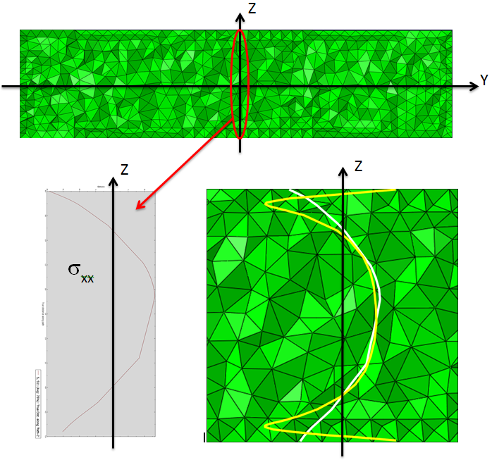 为了比较应力场,我们创建了类似的矩形零件,并使用 Moldflow 的非机械应变检查流向中的应力分布是否如 Helius PFA 所预测的那样。下图显示了零件的横截面和预测的应力场。右下图描述了 Zheng [15] 生成的叠加曲线(以黄色显示)和 Helius PFA 预测的曲线(以白色显示)。这些曲线代表不受约束、扭曲的零件并且没有外部载荷的应力场。