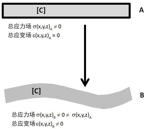 为了实现此目的,我们需要根据配置 A 确定残余或非机械应变。首先,我们在配置 A 中写入总应力场的方程。