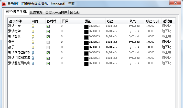 执行以下步骤可以指定门窗组合样式的一个或多个剖切面的特性。剖切面显示特性只应用于在图形的“俯视图”(平面图)中使用的显示模式(如“平面”)。