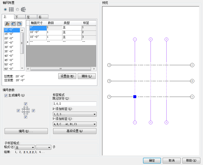 - 后续添加的主格线将具有根据在“柱网轴线”对话框中的“标签格式”设置生成的标签和标签值。