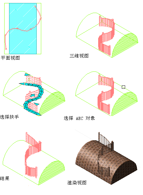 使用以下步骤可将现有扶手定位到除楼梯外的 AEC 对象。一旦附着了构件,扶手即保持其在图形中的位置,但它会随同附着对象一起移动。这使您可以沿楼梯或其他对象创建扶手的任意走向。