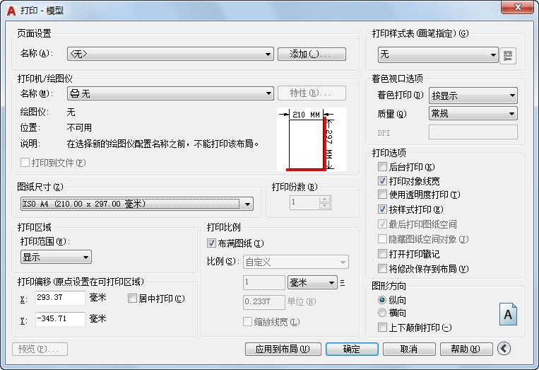 打印布局时,将打印指定图纸尺寸的可打印区域内的所有内容,其原点从布局中的 0,0 点计算得出。