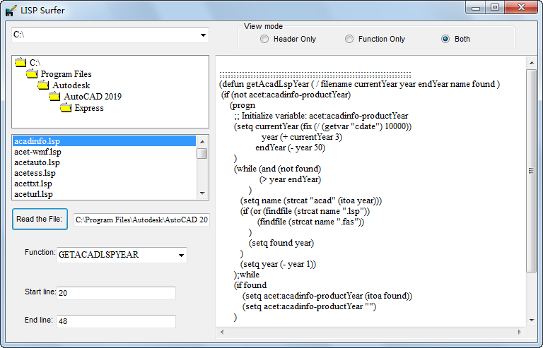 按单个函数显示 AutoLISP 文件的内容。