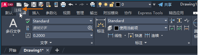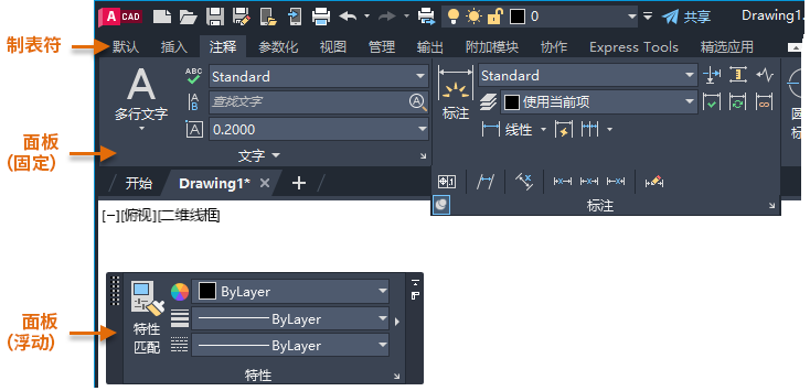 功能区是 AutoCAD 应用程序窗口的主要区域,通过它可以访问用于在图形中创建和修改对象的工具。可以将每个功能区选项卡视为相关工具的逻辑分组。功能区选项卡上的面板有助于进一步优化每个逻辑分组。