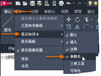 功能区选项卡或面板的显示状态可以根据是否使用属于该逻辑编组的工具进行更改。如果在任意选项卡上单击鼠标右键,可以看到当前显示的选项卡(名称前面的复选标记)和当前隐藏的选项卡。也可以在当前选项卡上单击鼠标右键,以查看当前为该选项卡显示或隐藏哪些面板。