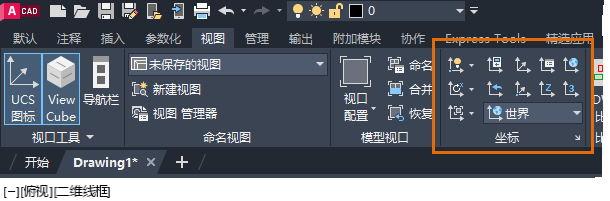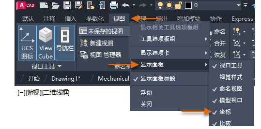 在本练习中,您将隐藏“参数化”功能区选项卡,并在“视图”选项卡上显示“坐标”面板。