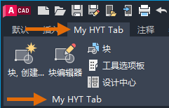新的功能区选项卡不会自动添加到工作空间中。 以下步骤介绍了如何将“我的 HYT 选项卡”添加到当前工作空间。