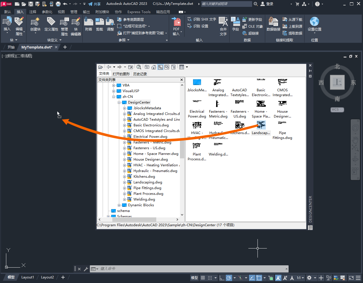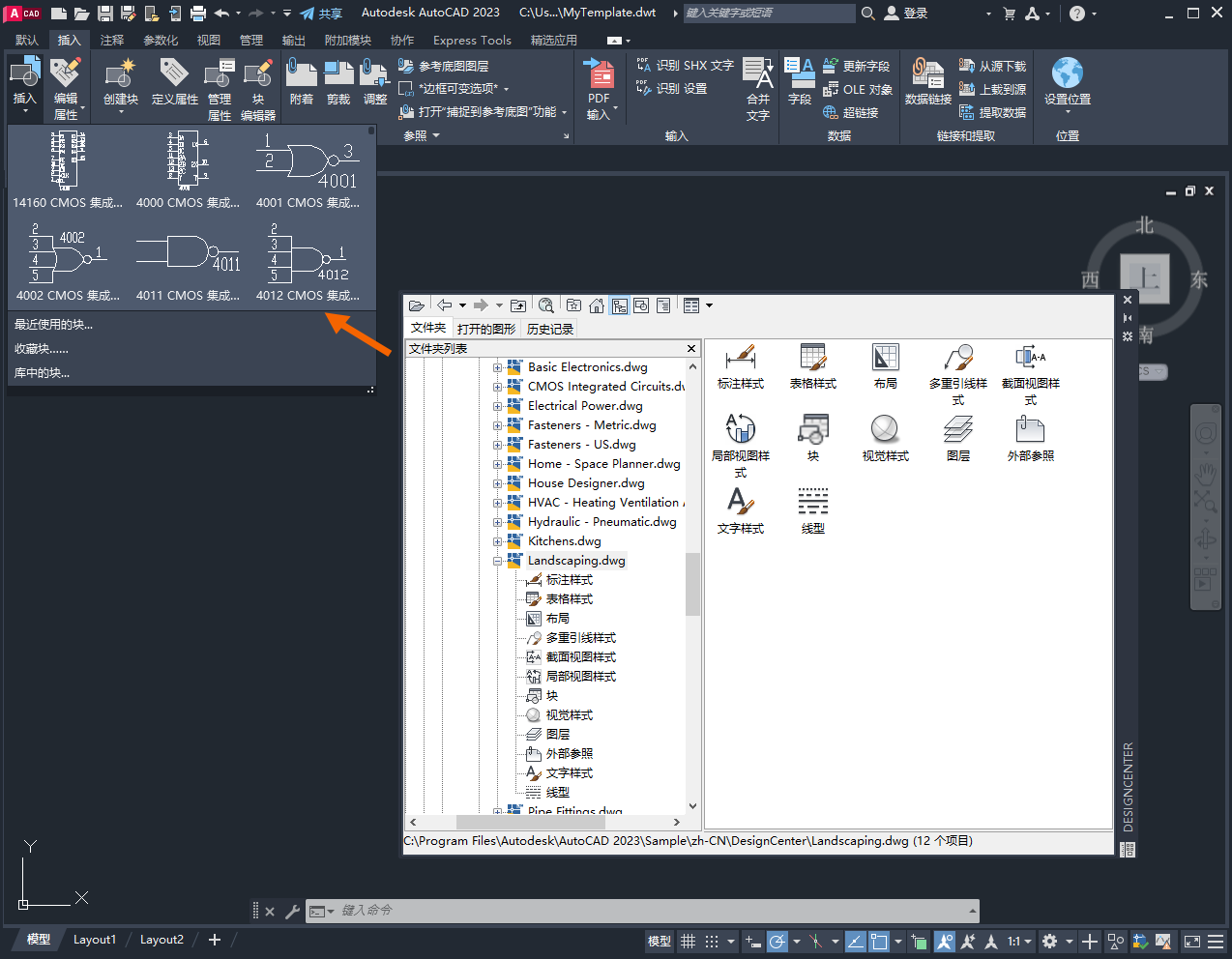 现在,在“Landscaping.dwg”中定义的命名样式、块和图形设置在“MyTemplate”中立即可用。